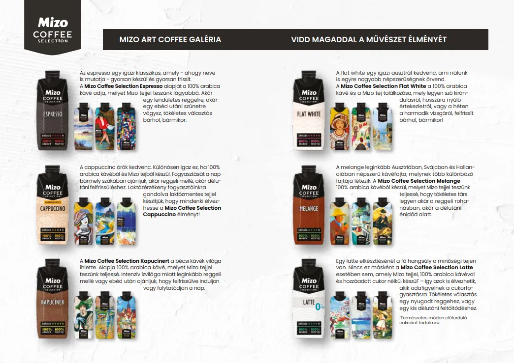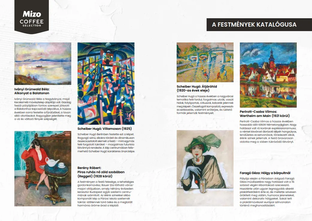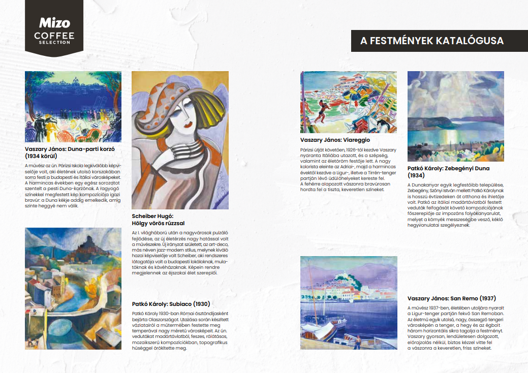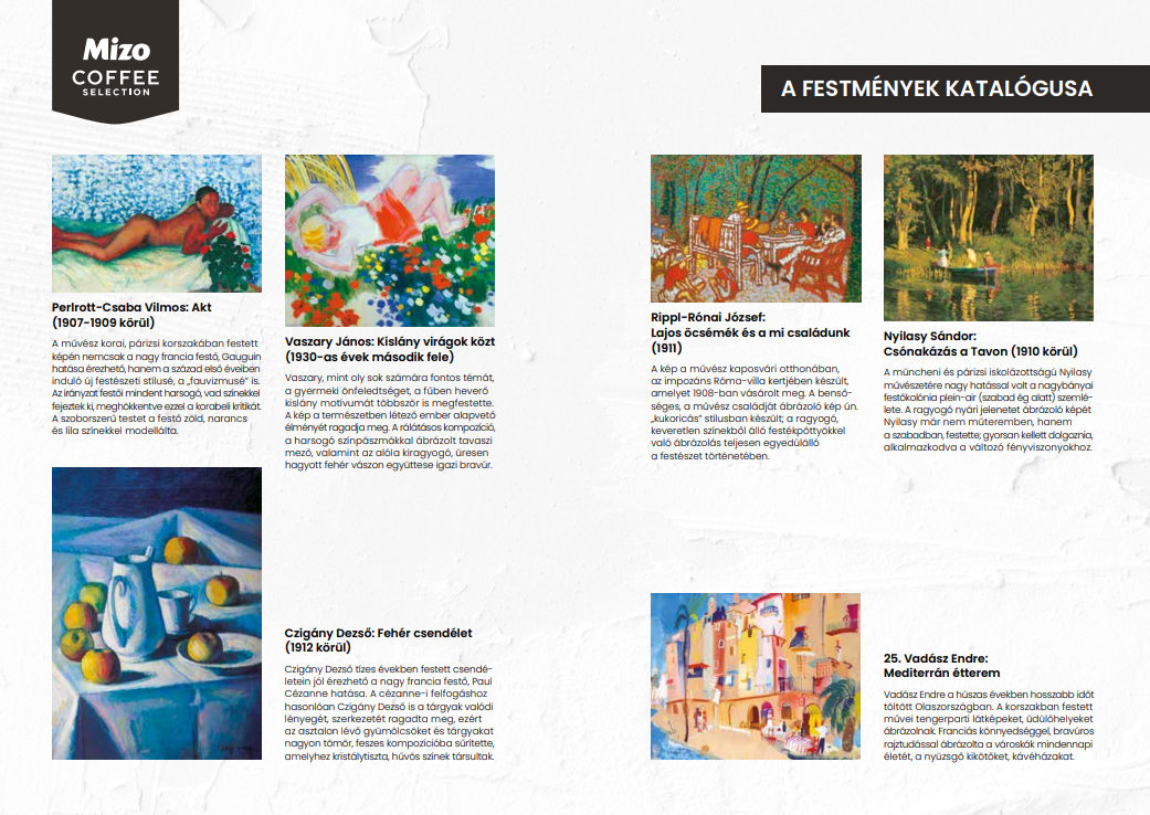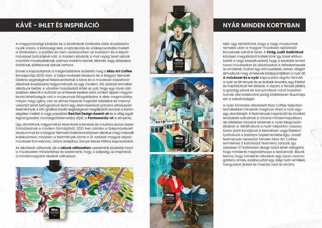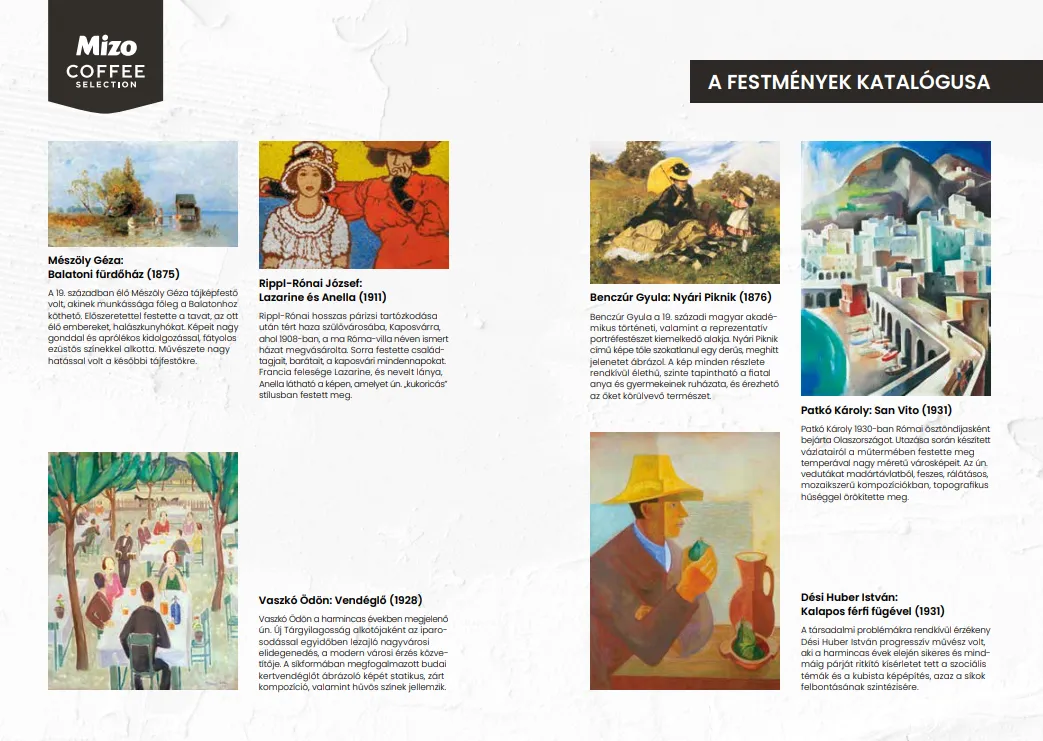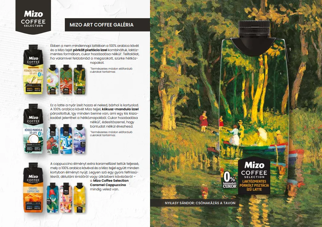 A korábbi Mizo Art Coffee kampányok népszerűségére építve ismét egyesítjük a művészet és a kávézás élményét a Mizo Coffee Selection termékcsalád új, limitált kollekciójában. A Virág Judit Galériával közösen megálmodott kollekció fókuszában ezúttal a magyar művészet rejtett kincsei állnak: idén a nagyközönség számára kevésbé ismert, ám kiemelkedő művészek festményei elevenednek meg a dobozokon, egy színes, nyári hangulatot idéző válogatásban. Célunk változatlan: közelebb hozni a művészetet mindenkihez és becsempészni a szépséget és az inspirációt a mindennapokba.